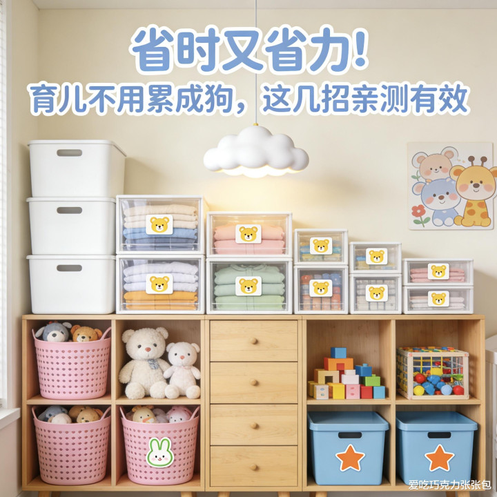 给宝宝的衣物、玩物、洗护用品分散专属收纳区,贴上标签,用完坐窝归位,幸免每次找东西倾肠倒笼;常用的纸尿裤、湿巾放在床头或婴儿床边,随取随用。
