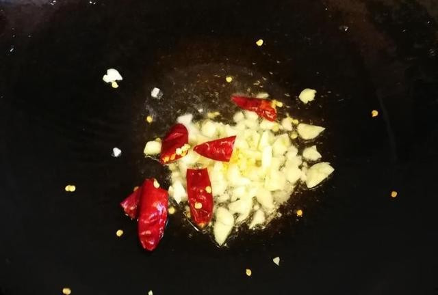 调味的部分不复杂,花椒和蒜片干辣椒用小火炒出香味,火大了容易糊,可以提前关火应用锅的余温把香味逼出来,闻到滋味了再开火下菜