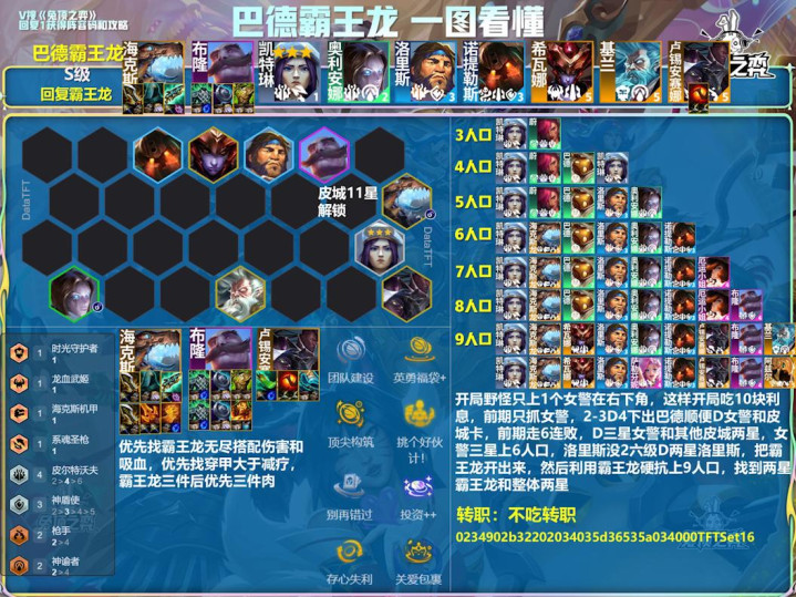 版块第9威望巴德霸王龙,最近官少爷在王者局险些把把在玩,这个威望霸王龙和皮城这个版块得到了加强,吃分的下限吃鸡的上限皆训诲了许多,玩法终点公式肤浅适合生人,开局一张女警右下角野怪就驱动吃利息,2-3D巴德和皮城的牌,赌出3星女警光速6东谈主口就不错解锁霸王龙,扛上9东谈主口两星霸王龙即是吃鸡了